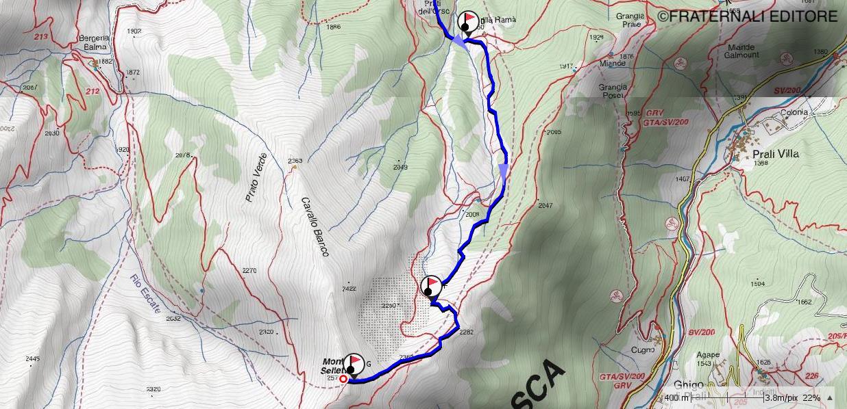 e-f: Si svolta a sinistra e con traccia migliore si sceglie il percorso sull’ampio pendio che porta alla spalla, che si segue fino a quota 2.343 m. Da qui la vista su tutte le montagne della conca di Prali è sorprendente e impareggiabile. I tetti dell’abitato sono proprio a picco sotto i nostri piedi e a monte, sul versante di Prali, sono state impiantate diverse barriere fermaneve. Da qui si raggiunge direttamente la vetta, su terreno gradualmente più ripido e che da ultimo costringe a mettere gli sci in spalla, ed eventualmente a calzare i ramponi, con non difficile ma aereo percorso.