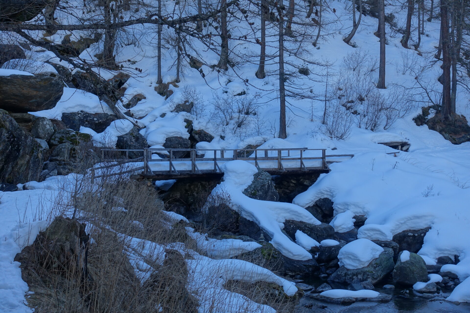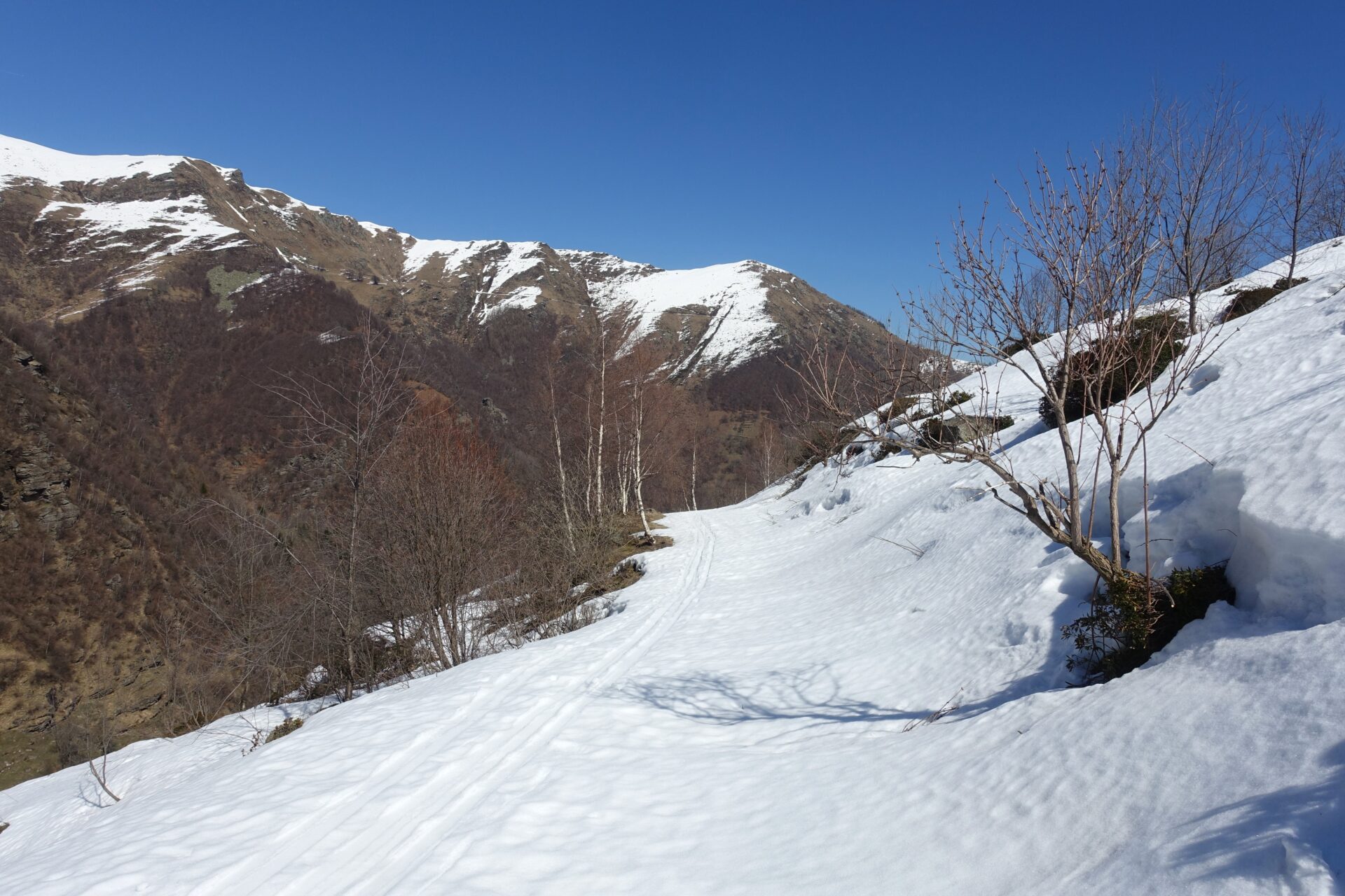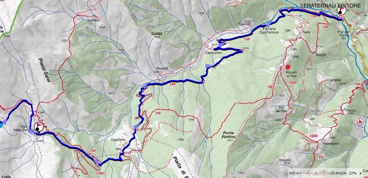 n-o: di qui è possibile intercettare la strada che serve l’alpeggio e seguirla, sempre sul lato destro idrografico del vallone, eventualmente compiendo tagli laddove le condizioni e la neve lo consentano. Si transita presso l’Alpe della Sella (1.806 m) e si continua a seguire la strada, ignorando l’incrocio per il Rifugio dei Sap, si transita presso la borgata Ceresarea (1.318 m) fino a raggiungere il Ponte di Barma Freida in Località Pra del Torno, meta finale della traversata.