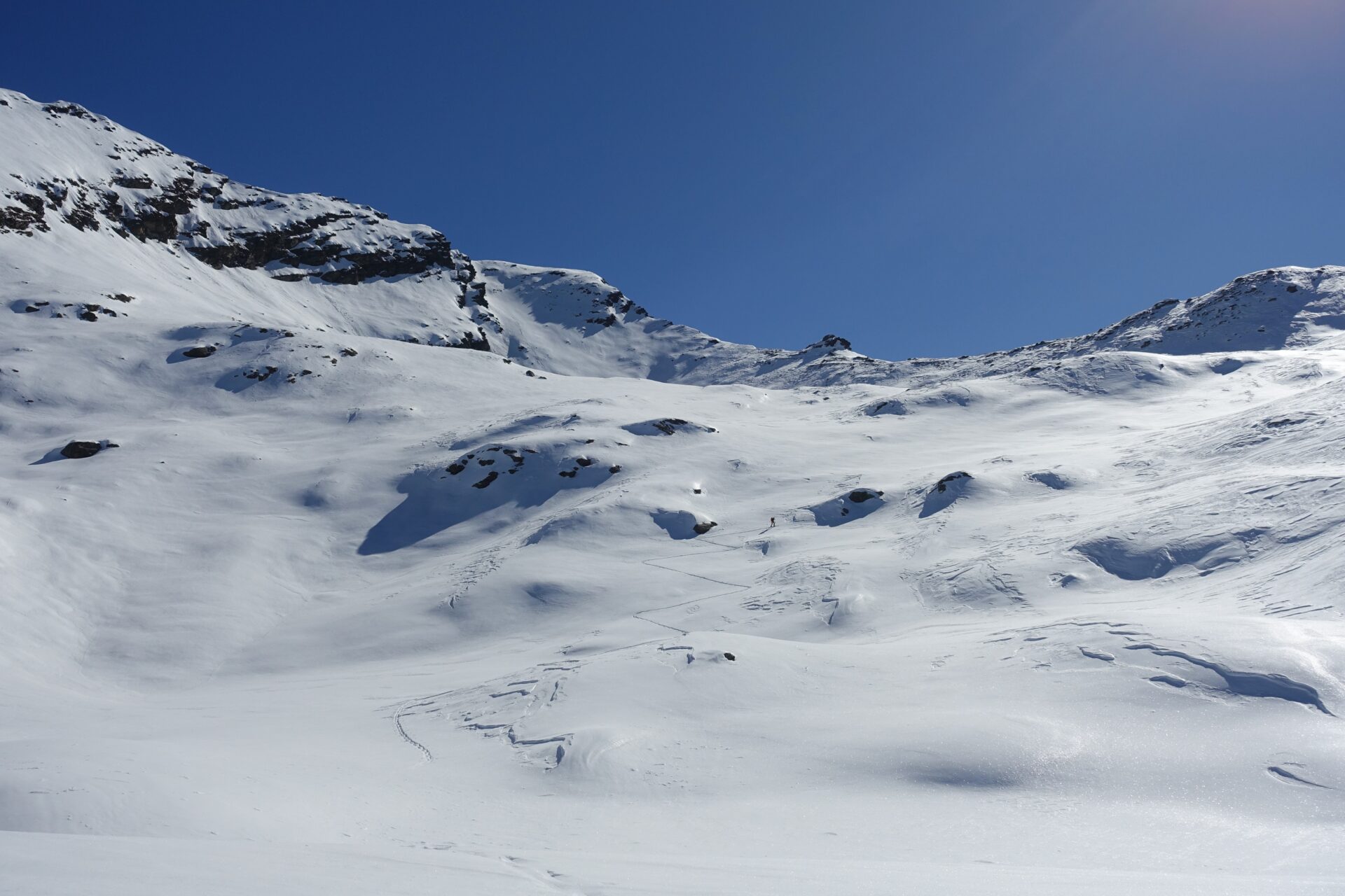 i-l: da questo punto occorre aggirare una cresta rocciosa, invalicabile a sci. L’aggiramento si compie sul versante di Conca Cialancia (nord), nella quale si scende a piacere, fino ad aggirare il costone che sostiene il filo di cresta che si è lasciato. A quota 2.600 m circa, è agevole contornare la base dello sperone indicato, puntando verso destra, fino a raggiungere una conca pianeggiante a quota 2.560 m circa.