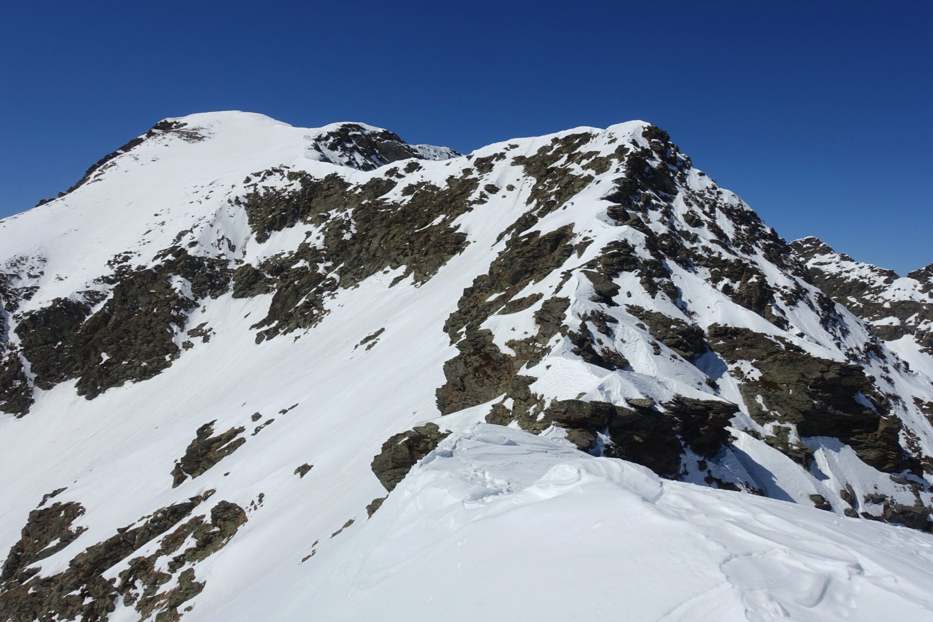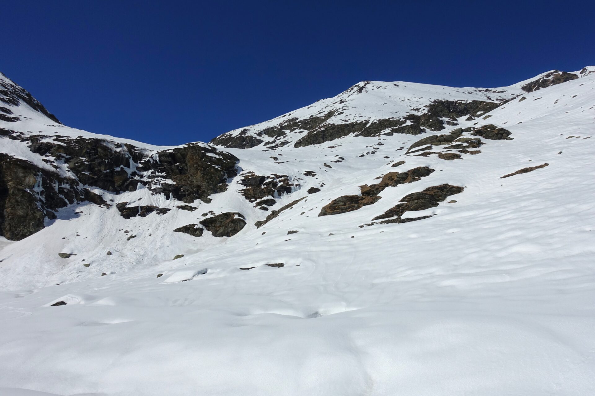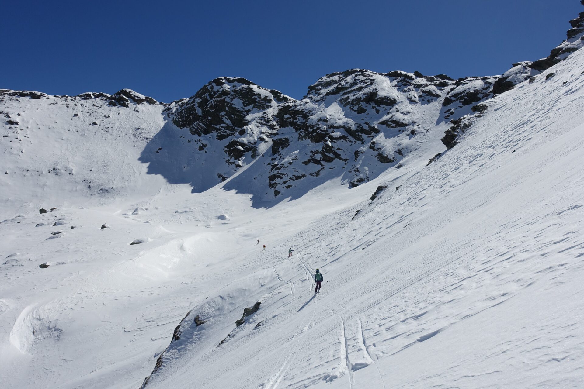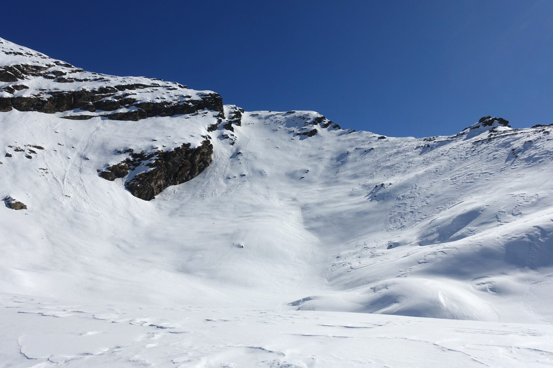 l-m: In questo punto si ripella e si entra nella conca alla nostra destra, al fondo della quale tre canali permettono di ritornare in cresta. Risalire quello più a sinistra, più ampio, meno incassato e più continuo (necessari ramponi e piccozza), fino a riguadagnare il filo di cresta al colletto, nuovamente sulla traccia del sentiero estivo, a quota 2.620 m.