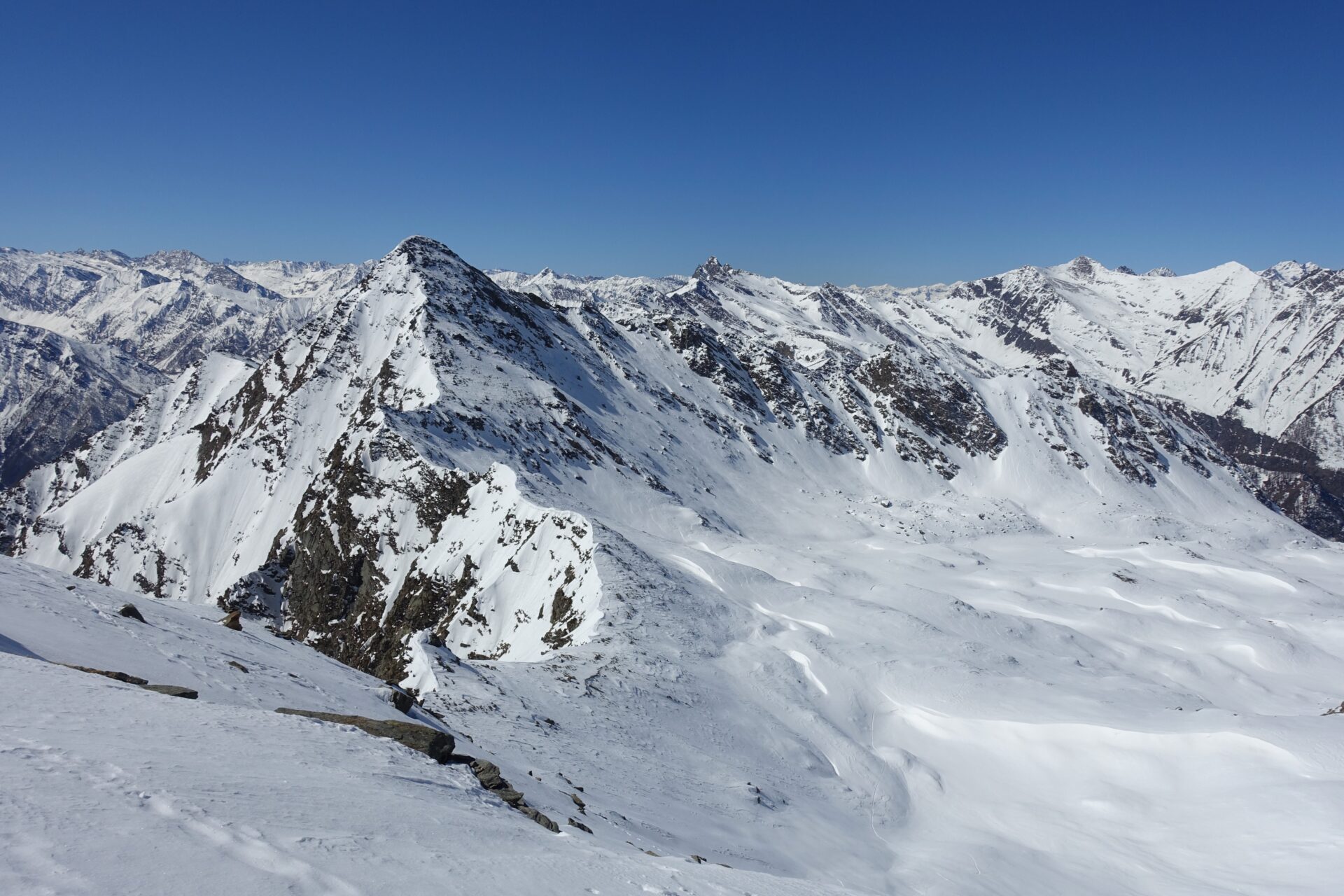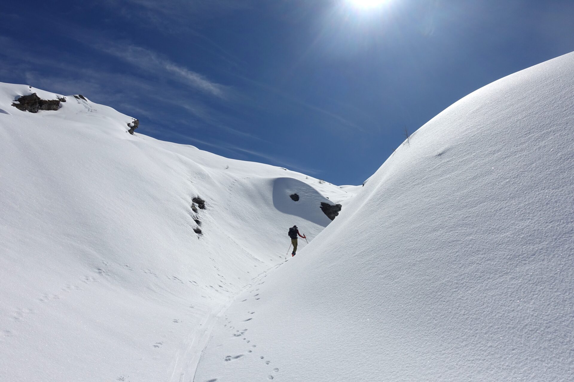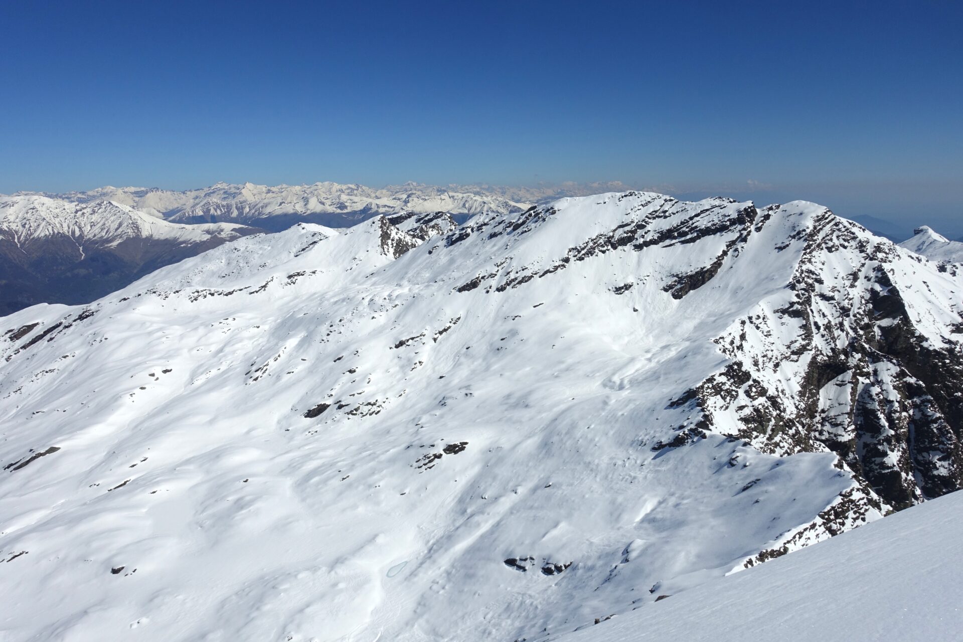 l-m: In questo punto si ripella e si entra nella conca alla nostra destra, al fondo della quale tre canali permettono di ritornare in cresta. Risalire quello più a sinistra, più ampio, meno incassato e più continuo (necessari ramponi e piccozza), fino a riguadagnare il filo di cresta al colletto, nuovamente sulla traccia del sentiero estivo, a quota 2.620 m.