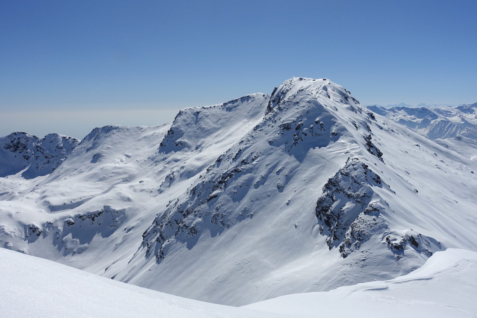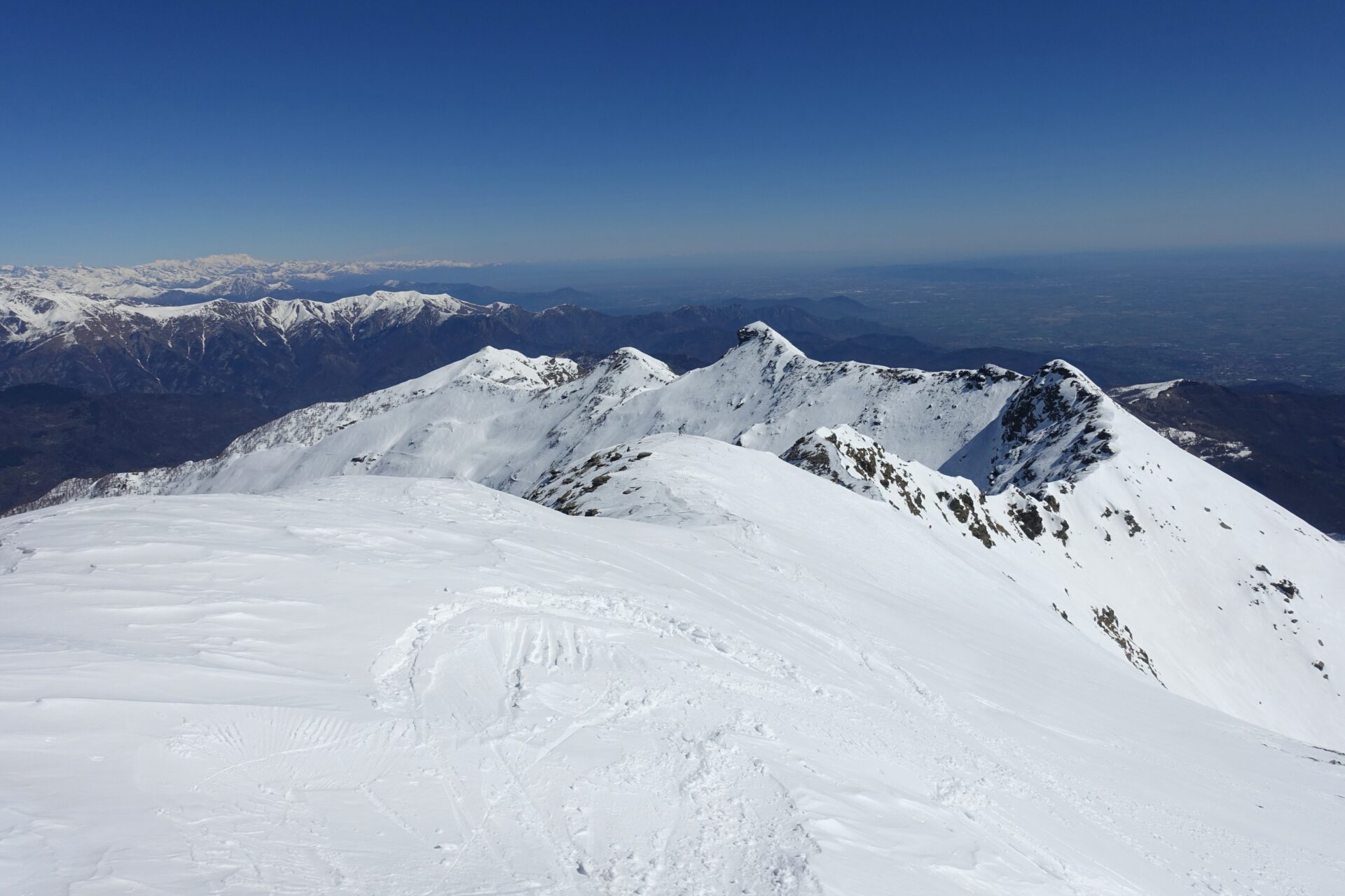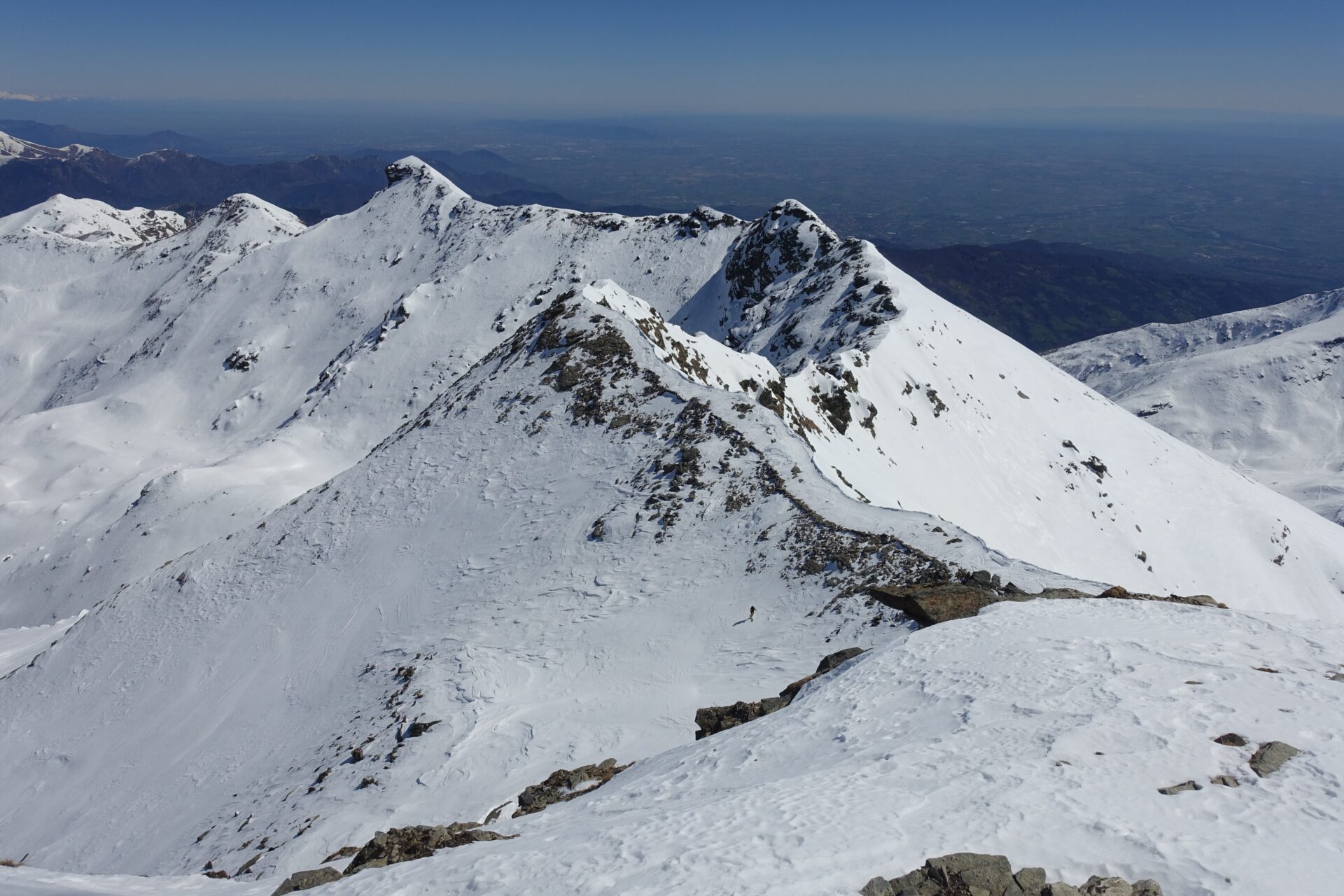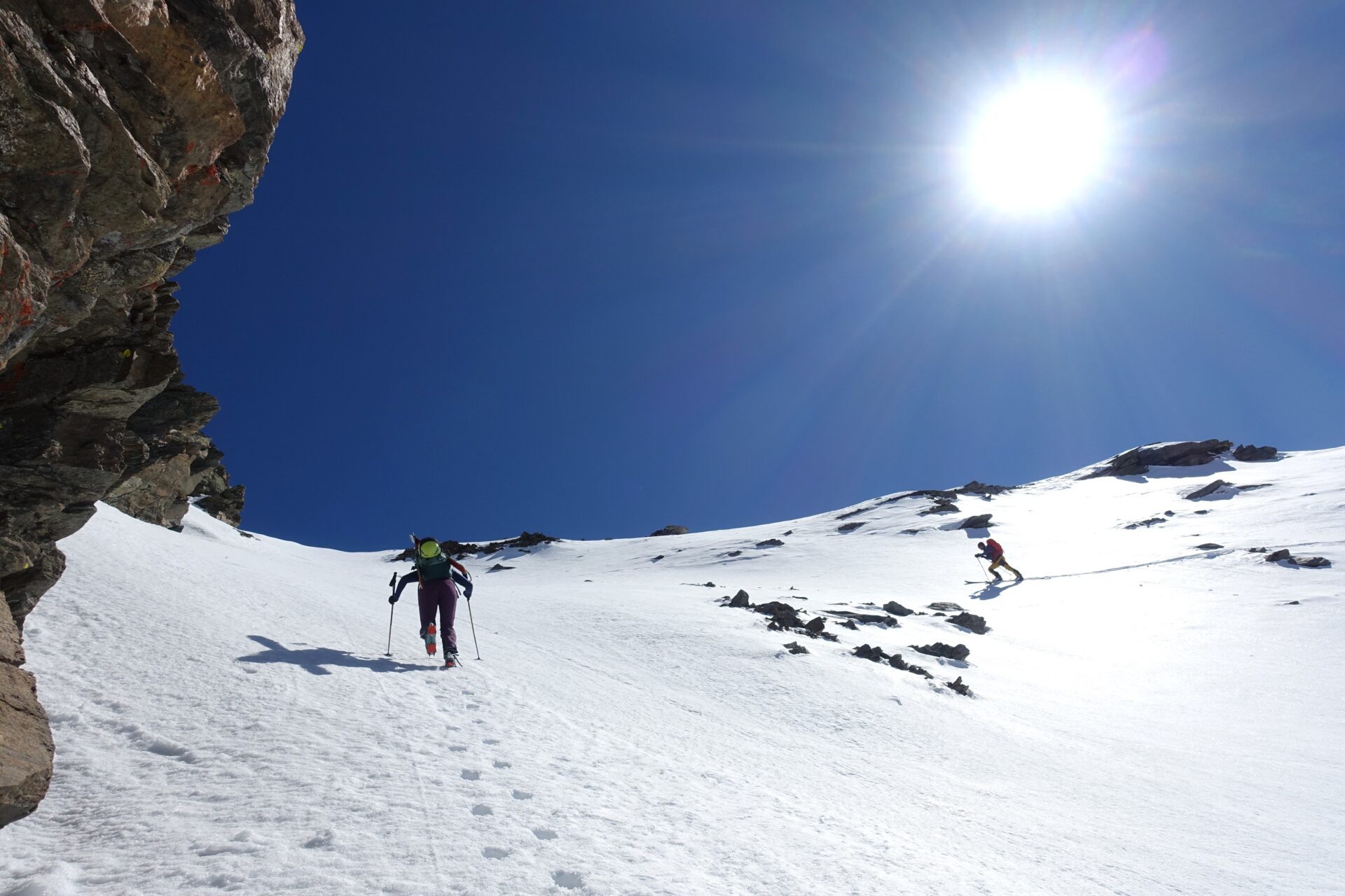 l-m: In questo punto si ripella e si entra nella conca alla nostra destra, al fondo della quale tre canali permettono di ritornare in cresta. Risalire quello più a sinistra, più ampio, meno incassato e più continuo (necessari ramponi e piccozza), fino a riguadagnare il filo di cresta al colletto, nuovamente sulla traccia del sentiero estivo, a quota 2.620 m.