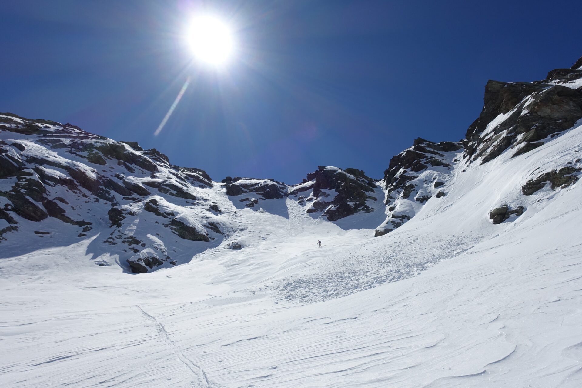 h-i: Dalla sommità del Passo Roux, scendere in controllo lungo la cresta nevosa, spartiacque tra Conca Cialancia e Alta Val d’Angrogna, restando alla destra del filo e, tramite un passaggio ripido, sempre sul lato Angrogna, pervenire a un colletto dove la cresta si fa pianeggiante a quota 2.740 m. Questa porzione percorre il tracciato del sentiero estivo. Occorre prestare molta attenzione a non scivolare o a non farsi trascinare da neve umida in questo tratto: in caso di caduta si è esposti alle alte balze rocciose poste sopra la conca del Lago Laus.