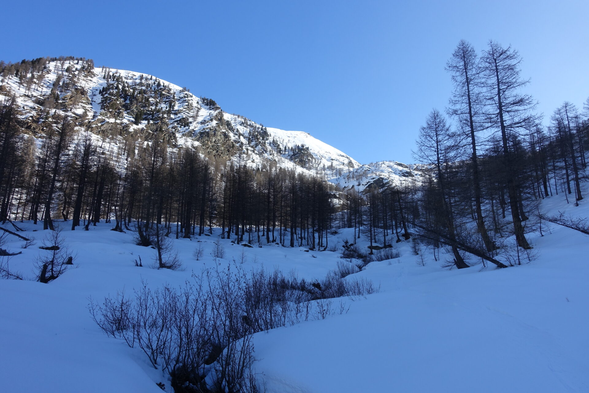 d-e: Dalla radura, attraversare il rio e cominciare, tendendo sulla sinistra, a risalire il lato destro orografico del vallone, andando a intercettare la pista che scende dalla Conca verso le Bergerie del Torre, a quota 2.180 m circa.