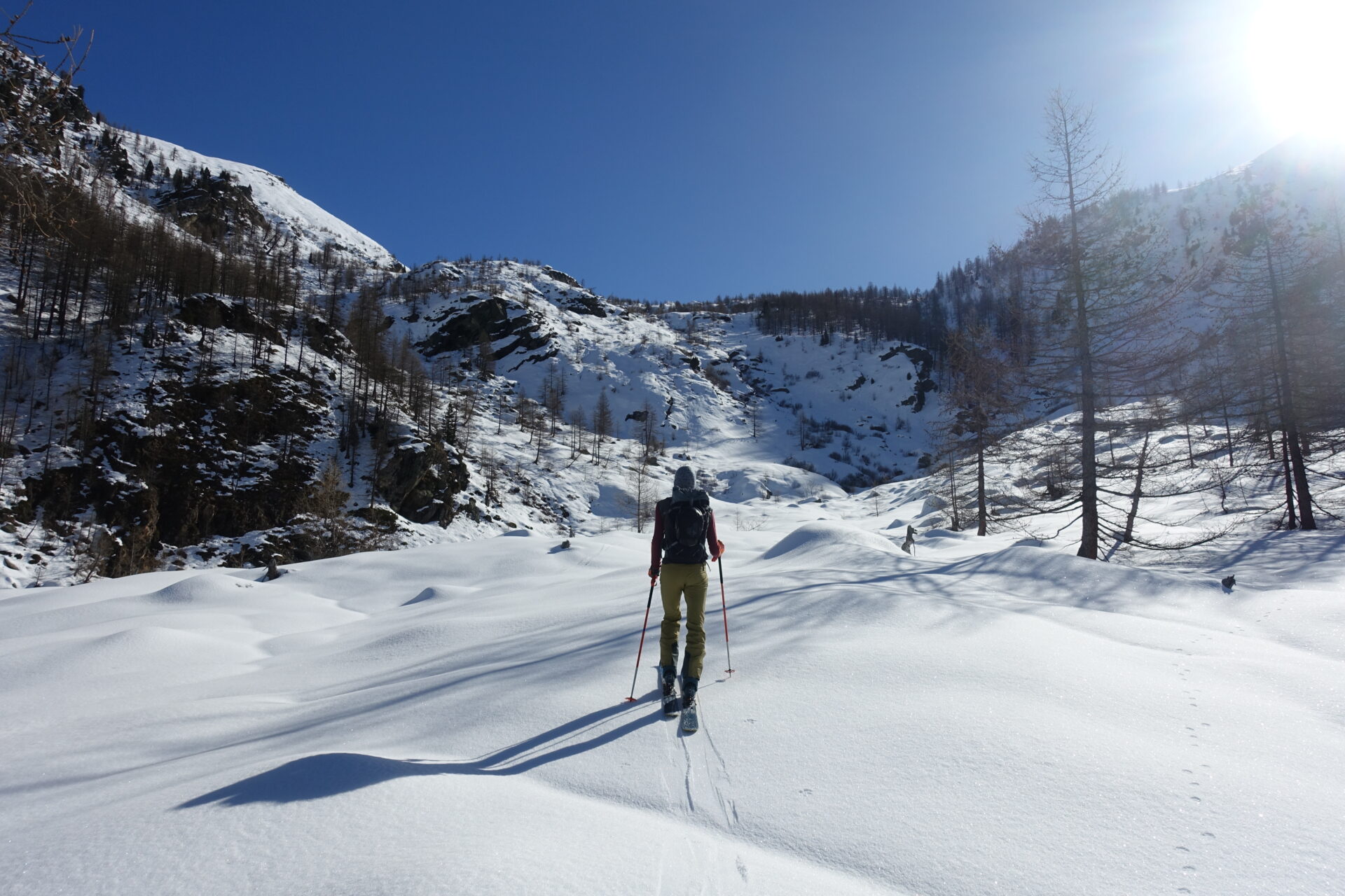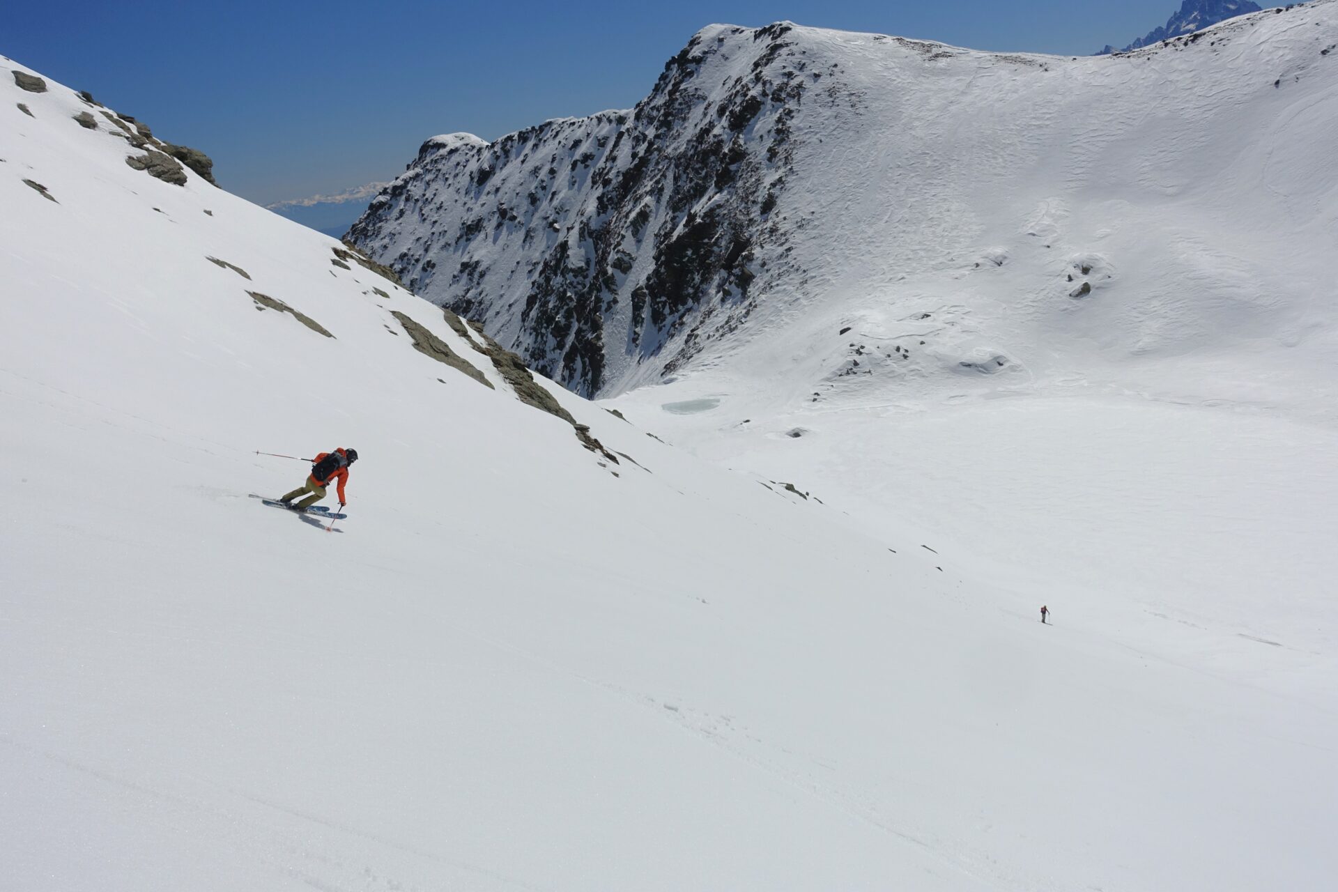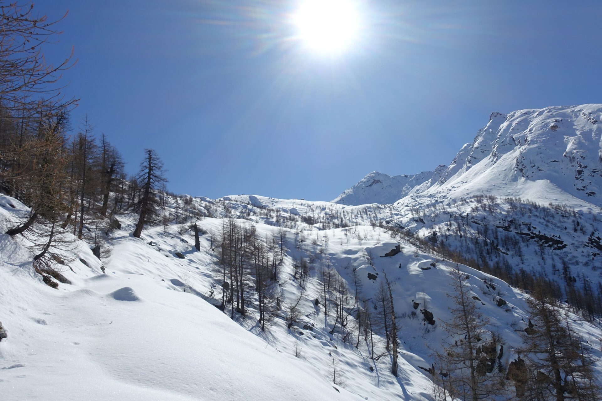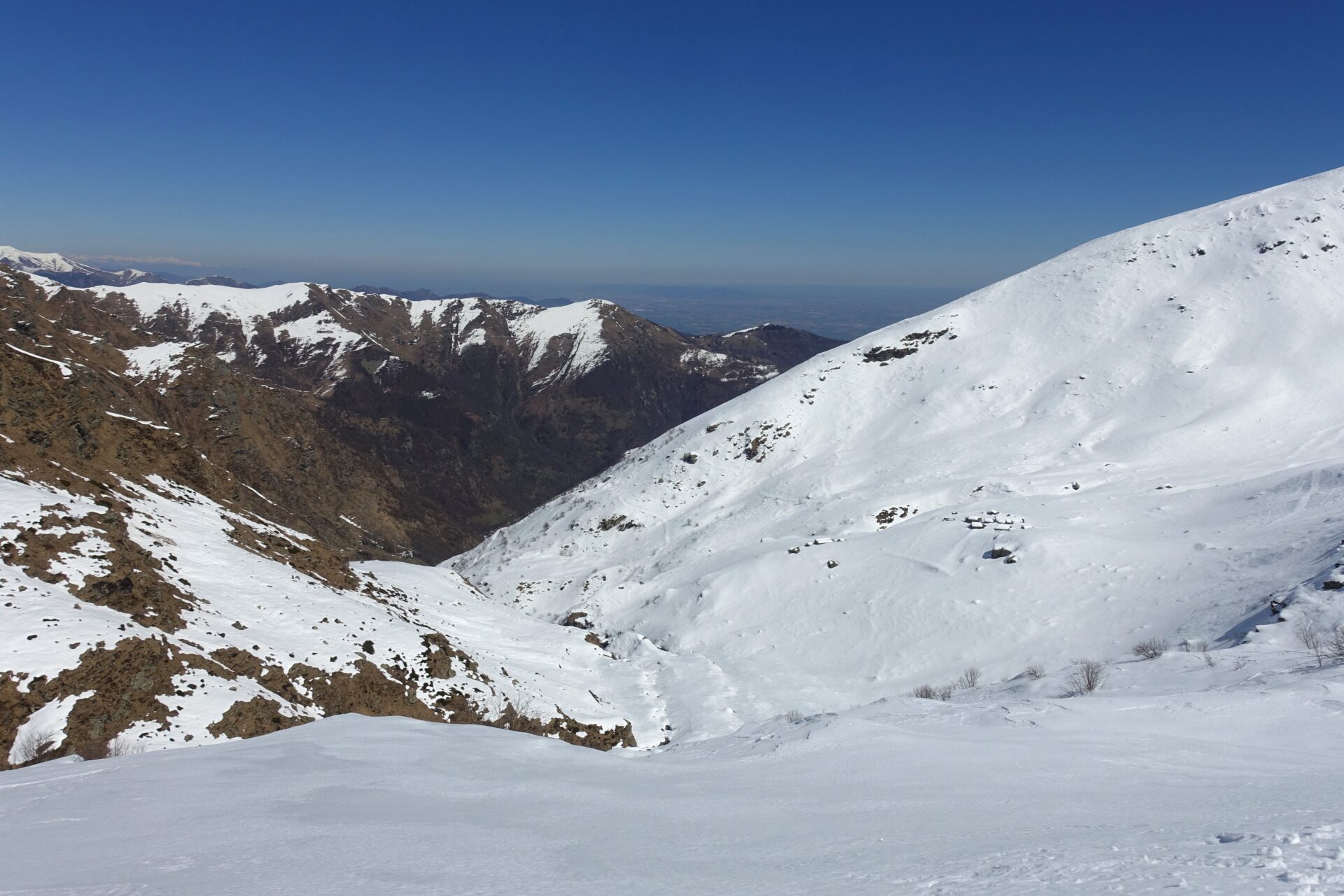 m-n: Da qui è ben visibile la discesa sulla Val d’Angrogna. Discendere gli eleganti, ampi e ripidi pendii esposti a sud, a picco sul Lago Laus (2.451 m), lasciandolo sulla destra. Senza percorso obbligato, ma facendo attenzione ai numerosi cambi di pendenza del vallone, sciare compiendo un ampio arco verso sinistra, per poi rientrare a destra, in modo da aggirare un risalto roccioso dal quale spesso si formano cascate di ghiaccio, fino a giungere al pianoro dell’Alpe di Sella Vecchia (2.060 m).