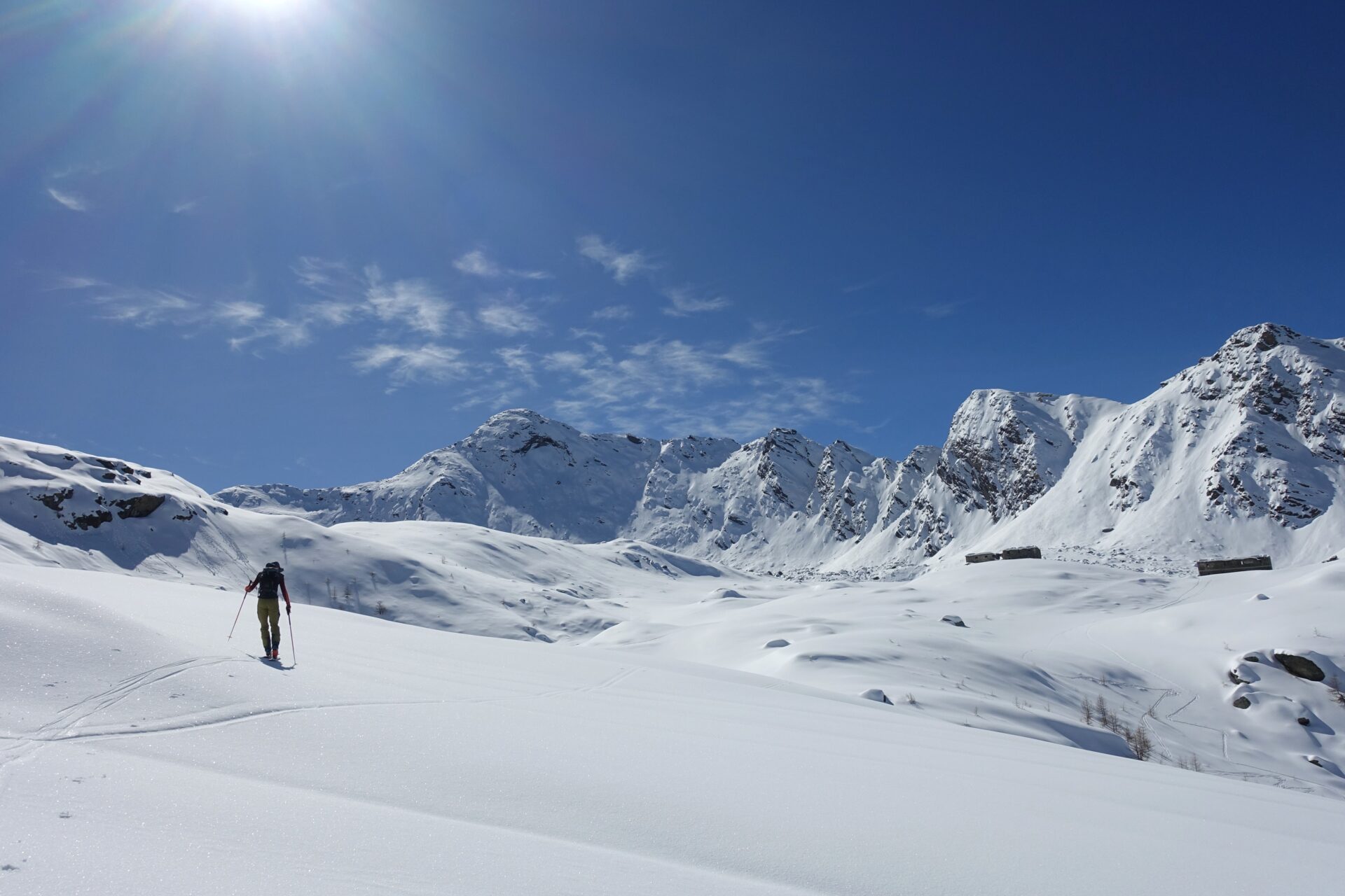 e-f: Seguire grosso modo la pista: puntare ai grossi ruderi dei Ricoveri Perrucchetti, senza però risalire per aggiungerli. Durante questo traverso, su morbidi dossi in direzione est, lasceremo sotto di noi il Lago Primo e giungeremo nei pressi del Lago dell’Uomo a quota 2.380 m circa, appena al di sotto dei ruderi dei casermoni militari.