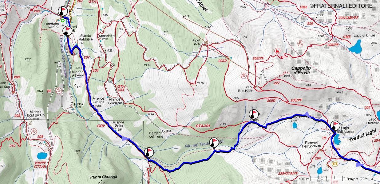 b-c: Dirigersi verso il Vallone delle Miniere, seguendo la stradina per superare le Miande Rabbiere, Miande Albergie, Miande Filharia e Miande Selle, fino ad attraversare il Rio Tredici Laghi sul caratteristico Pont dâ Riou a quota 1.736 m.