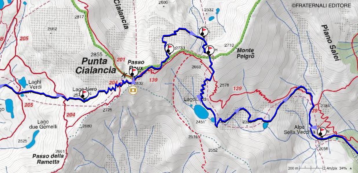 che con morbide pendenze condurrà a un pianoro a quota 2.500 m circa. Continuare in direzione est, passando tra i due Laghi Verdi (2.511 m) e proseguire, sempre per morbide pendenze, fino alla conca in cui sorge il Lago Nero, a quota 2.628 m.